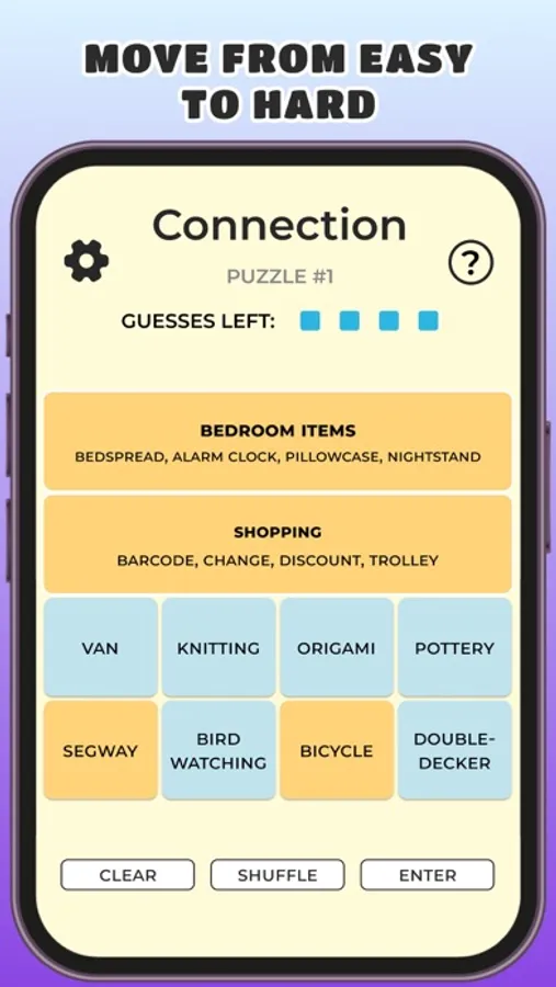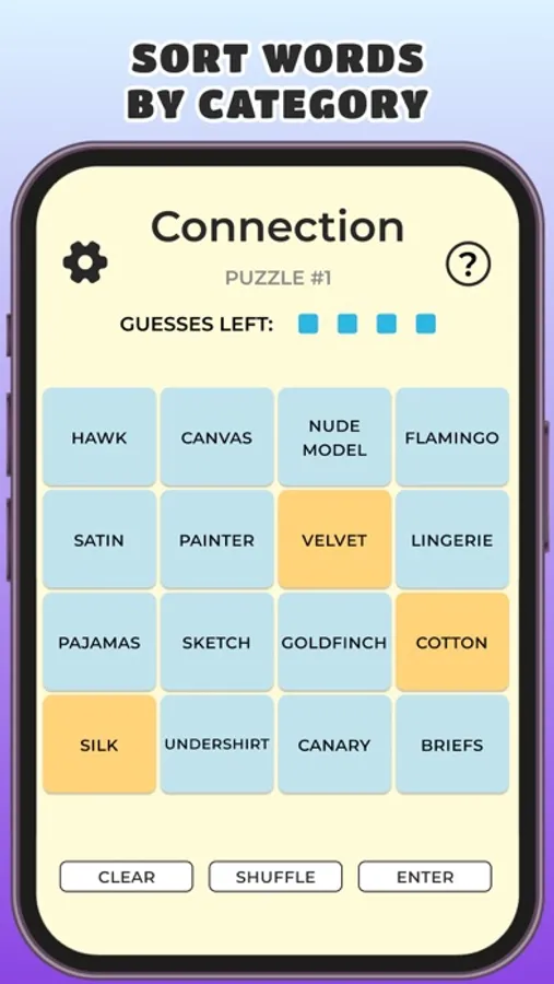 The gameplay is straightforward yet highly addictive. Once you've selected a group of four tiles, the moment of truth arrives: you press 'Enter' to see if they indeed belong to a common category. With each correct word match, you'll inch closer to victory, unlocking new challenges and expanding your mental prowess. With the tap of a button, you can shuffle the tiles or clear your selection, allowing you to approach each word puzzle with a fresh perspective.