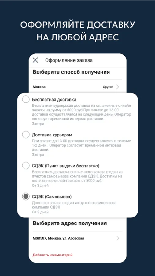 ⁃ Бесплатная курьерская доставка заказов от 5000 рублей, доставка курьером, доставка СДЭК в пункт выдачи и самовывоз.
