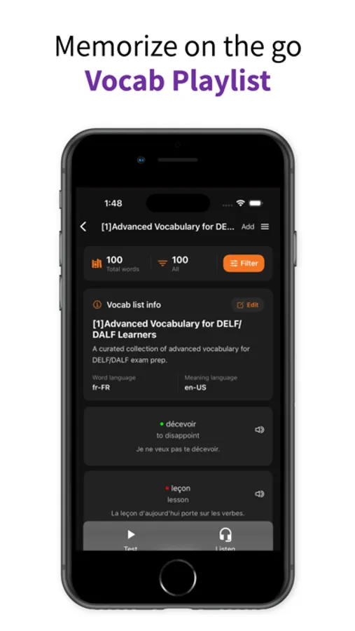 Create vocab lists easily on PC: Build and organize your vocabulary on your computer, then import it into the app and start learning by listening.