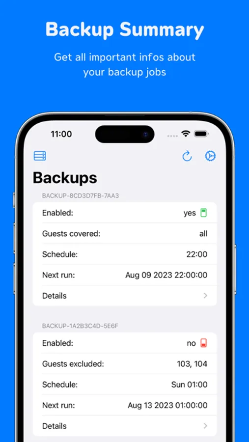 • Show backup-details, start backups
