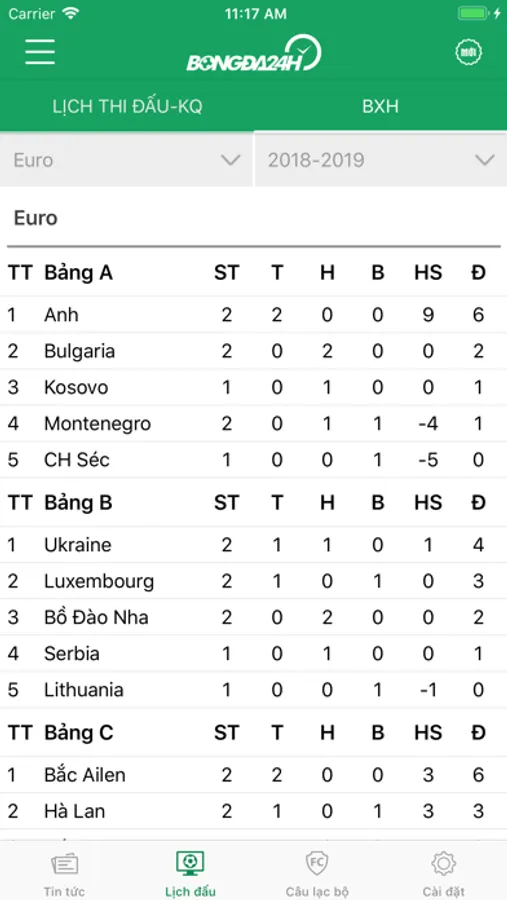 Bong da 24h cập nhật liên tục Kết quả những trận đấu nảy lửa, những bàn thắng đẹp mắt, bình luận, tin tức trong và ngoài sân cỏ, lịch thi đấu, bảng xếp hạng của các giải đấu.