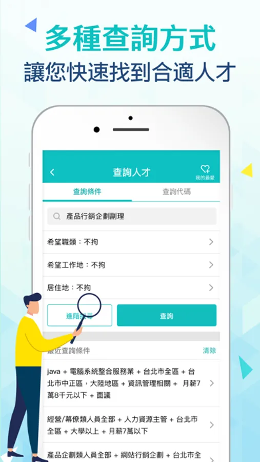 不管是透過完整條件查詢[查詢人才],或是輕鬆點選[查詢配對]人才,甚至是參考[推薦履歷],三種方式都可以讓您方便輕鬆找到適合人選。
