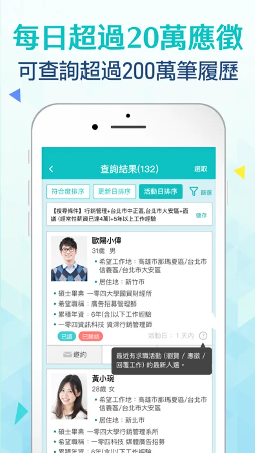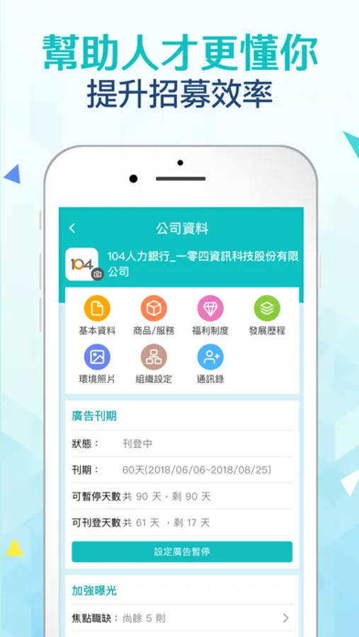 當有求職者主動應徵時,第一時間傳送通知,滑開手機就可立刻看履歷;也有貼心的「7天職務更新」提醒,讓您輕鬆設定讓廣告排序往前,職務更容易被求職者看到!