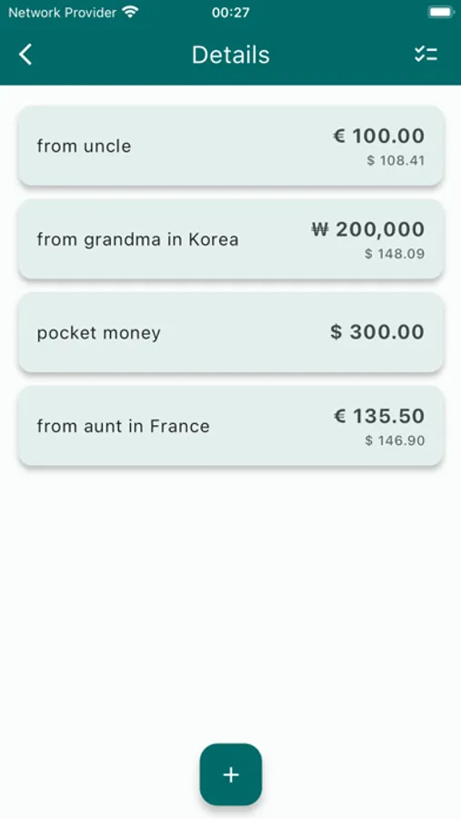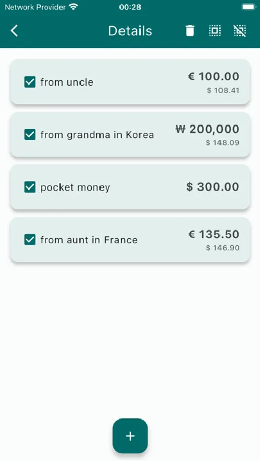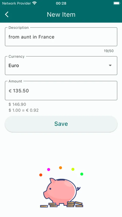 An piggybank app with the support of multi-currencies. Users can store their money with different descriptions and different currencies. In the home screen, users are going to see the sum of all their money in the currency of their default currency they set up from the Settings.