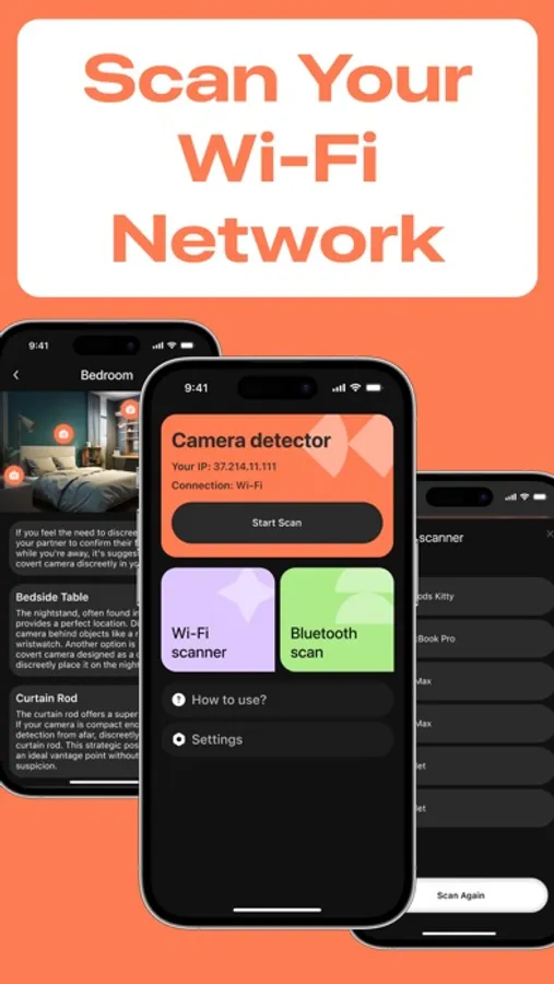 Protect your privacy effortlessly with our powerful app designed to uncover hidden cameras with ease. A single tap scans your network for suspicious devices, helping you locate concealed spy cameras in sensitive areas. Utilizing advanced Bluetooth and Wi-Fi scanning, the app identifies connected devices, retrieves their MAC addresses, and cross-references them in the cloud, providing detailed information like device names, types, manufacturers, and more.