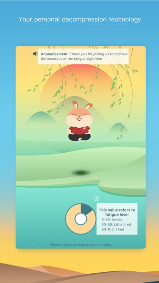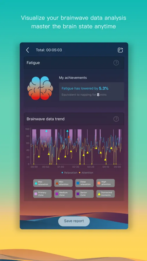 Record every meditation results and total length scientifically. Fatigue test, data acquisition, relaxation and attention recording, eSense state graph recording accurate to per second.