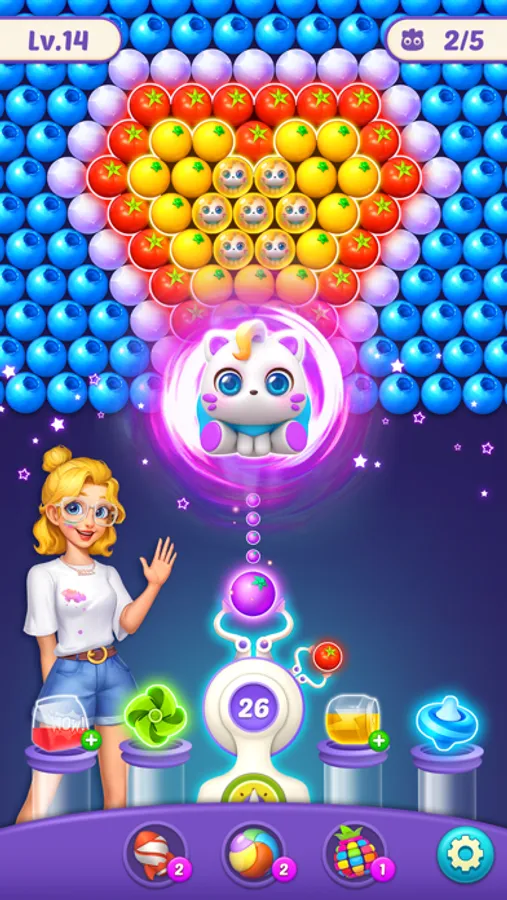 Match and pop fruit bubbles to create different boosters such as Bomb, Spinning top and Soda can, which can be merged into a more powerful one!