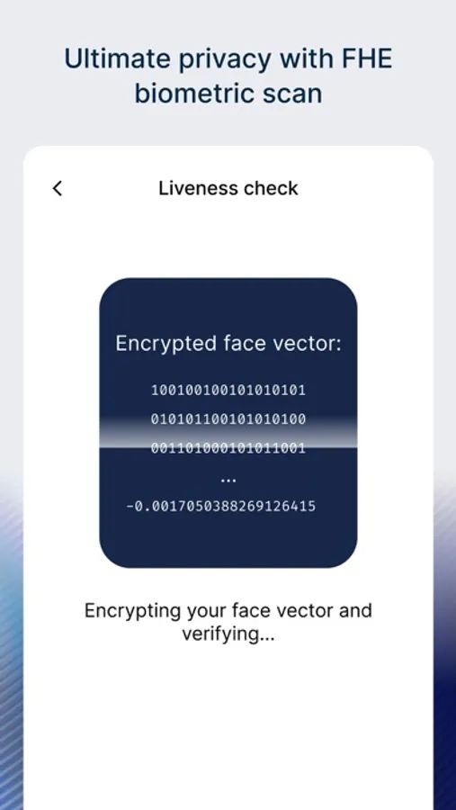 Secure your presence on Web3 and Web2 platforms without compromising personal details. With the FheID app, validate your biometric data in real time using your phone's camera. Access services, airdrops, and rewards across various apps by simply confirming your authenticity as a real person, without disclosing any personal information like your name, email, or sensitive biometric details.