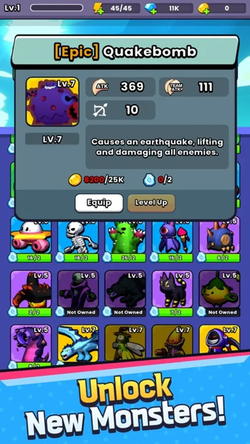 Combine various equipment and monster skills to defeat waves of monsters like Slimes, Zombies, and Vampires, and overcome the trials!