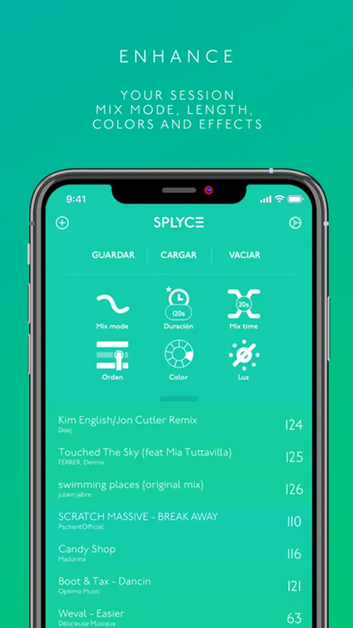 For a mind blowing experience with your iPhone’s music, just select your favorite songs, order them (we’ll help you with BPM’s and visual clues) and click play! It’s really that simple! But Splyce has a lot more to offer: it will mix (for real) your music, you can select the mix mode and the mixing time, and turn on light and visual effects that will allow you to throw the best parties in town. It’s like having your own DJ always with you!