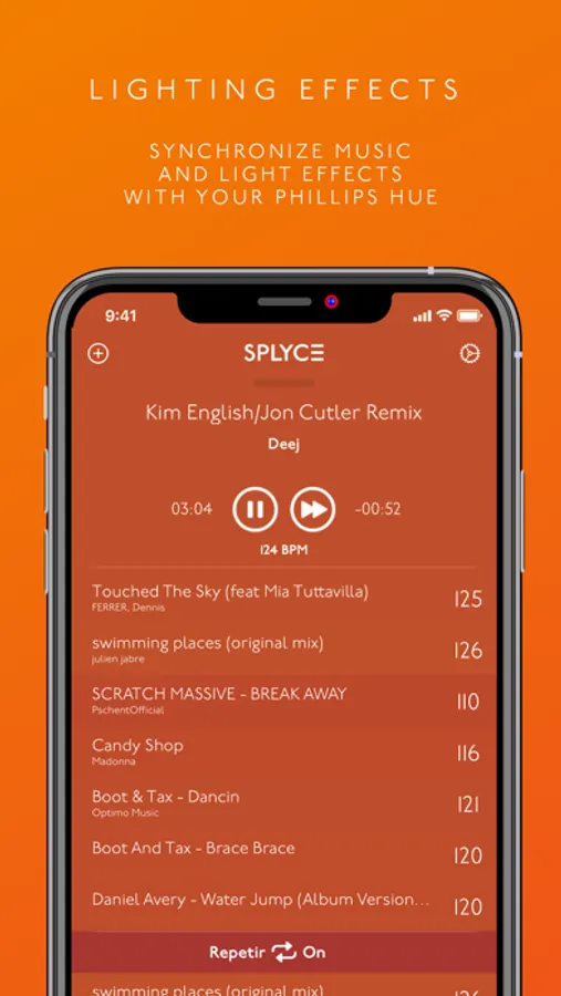 Connect Splyce to Philips(R) Hue lights, and experience how music and light effects can work together to make your experience even greater. Intensity and color will vary depending on the song BPM’s, synchronizing music & lights automagically.
