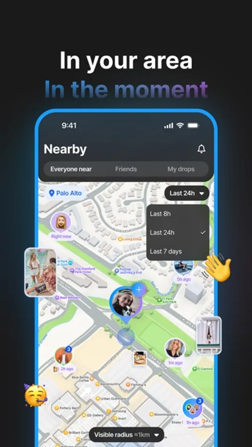 Discover Droppy – the app that keeps you connected with friends and helps you meet new people. Forget endless texts about where you are or what you're up to. Just drop a moment and let it speak for you. See your friends around the world and find out who’s having fun with you at concerts, parties, or while traveling. Share experiences together and expand your connections naturally and effortlessly!