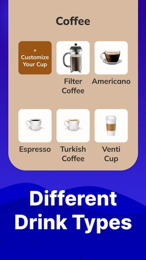 Our water drinking app doesn’t just remind you to drink water! It offers a comprehensive database with a wide range of beverages, from various teas and coffees to fruit juices and soft drinks. View detailed hydration information, caffeine tracker, and calorie tracker for each drink, enabling you to make informed choices about what you consume. Choose from an extensive list of options or add your custom drinks for accurate tracking.