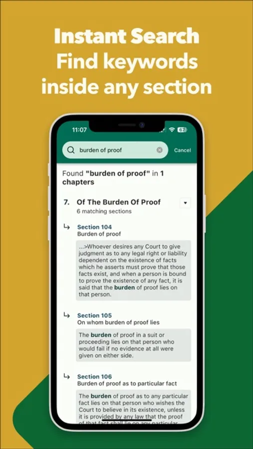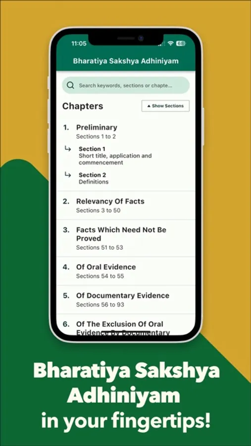 Navigate through the law with ease. Our app neatly categorizes the Bharatiya Sakshya Adhiniyam into well-structured chapters and sections, making it simple to find exactly what you need.