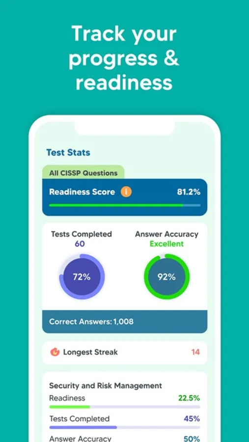 Additionally, our mobile app provides a personalized study plan based on your skill level, study frequency, and target test date. Not sure when you want to take the exam? You can adjust your study plan as often as you like. Our proprietary readiness score will help you determine when you’re ready to take the real exam and pass with a high score on your first try.