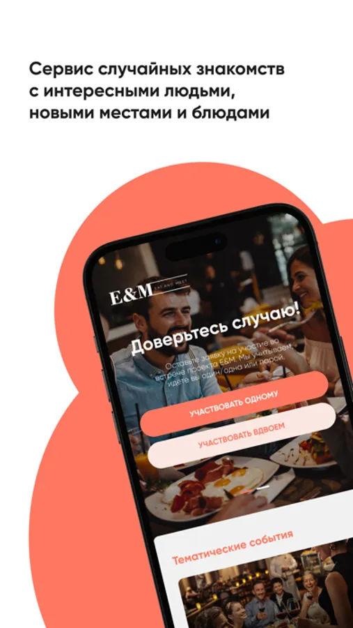 EAT&MEET - это сервис, который расширяет круг знакомств, способствует личному общению и наполняет нашу жизнь новыми эмоциями.
