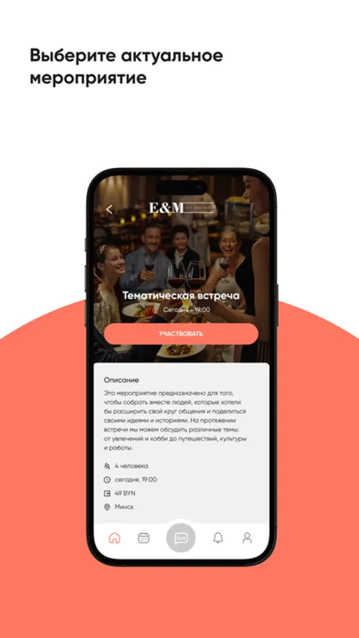 EAT&MEET — безопасная территория, все участники находятся в равных условиях, независимо от возраста, пола или профессии. За столом можно встретить новых друзей, вторую половинку, бизнес-партнеров, партнеров по спорту или просто интересных собеседников.