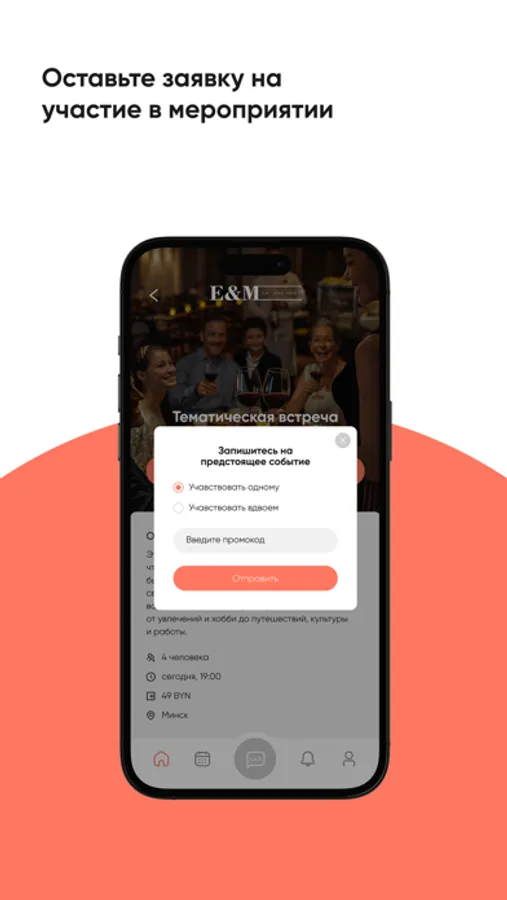В приложении комфортно выбирать дату, регистрироваться на встречу. Вы можете видеть анонсы тематических встреч. Посещая снова и снова встречи EAT&MEET, вы накапливаете баллы для системы лояльности. Приложение легкодоступно для скачивания и интуитивно понятно.
