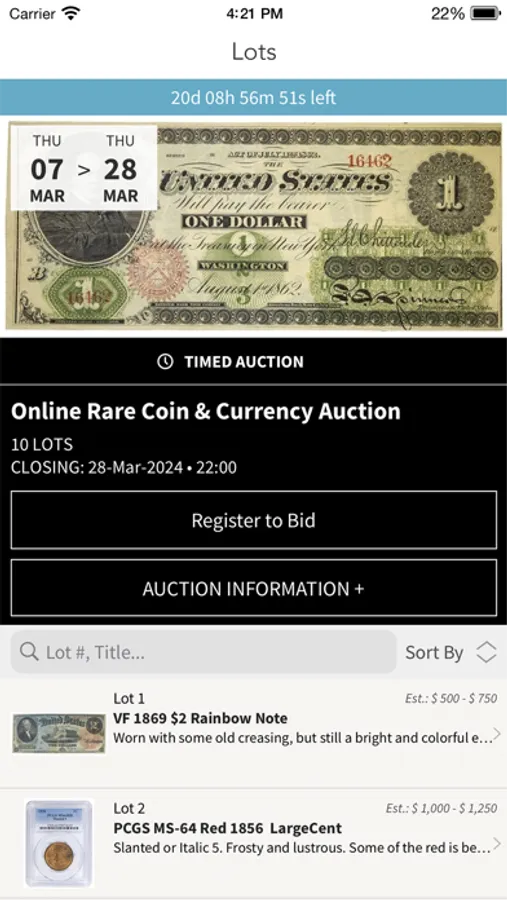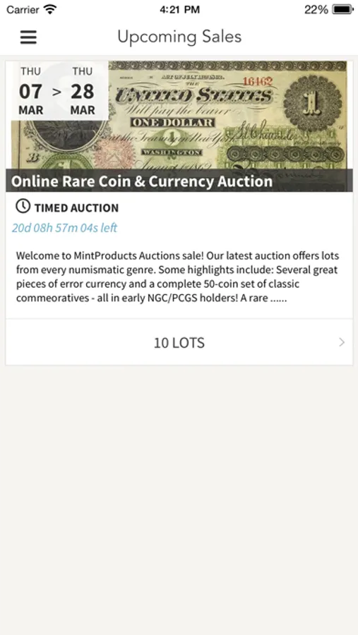 MintProducts Auctions hosts monthly online rare coin and currency auctions. We offer lots from all numismatic genres with nearly all being sold without reserve. Our owner, Jeff Kierstead has over 45 years of experience in the rare coin business and ran his first coin auction in 1983. Jeff is a member of the prestigious Professional Numismatists Guild as well as many other numismatic organizations. With the MintProducts Auctions app, you can preview, watch and bid in our auctions from your mobile / tablet device. Participate in our sales while on-the-go and gain access to our following features: Quick Registration Following upcoming lots of interest Push notifications to ensure you engage on items of interest Track bidding history and activity Watch live auctions