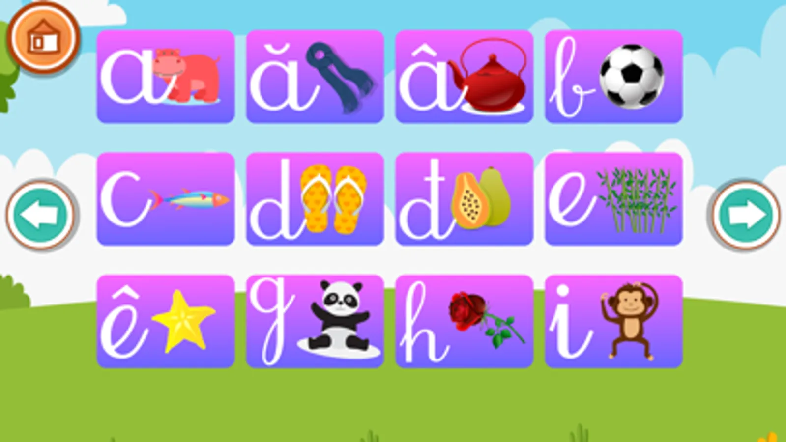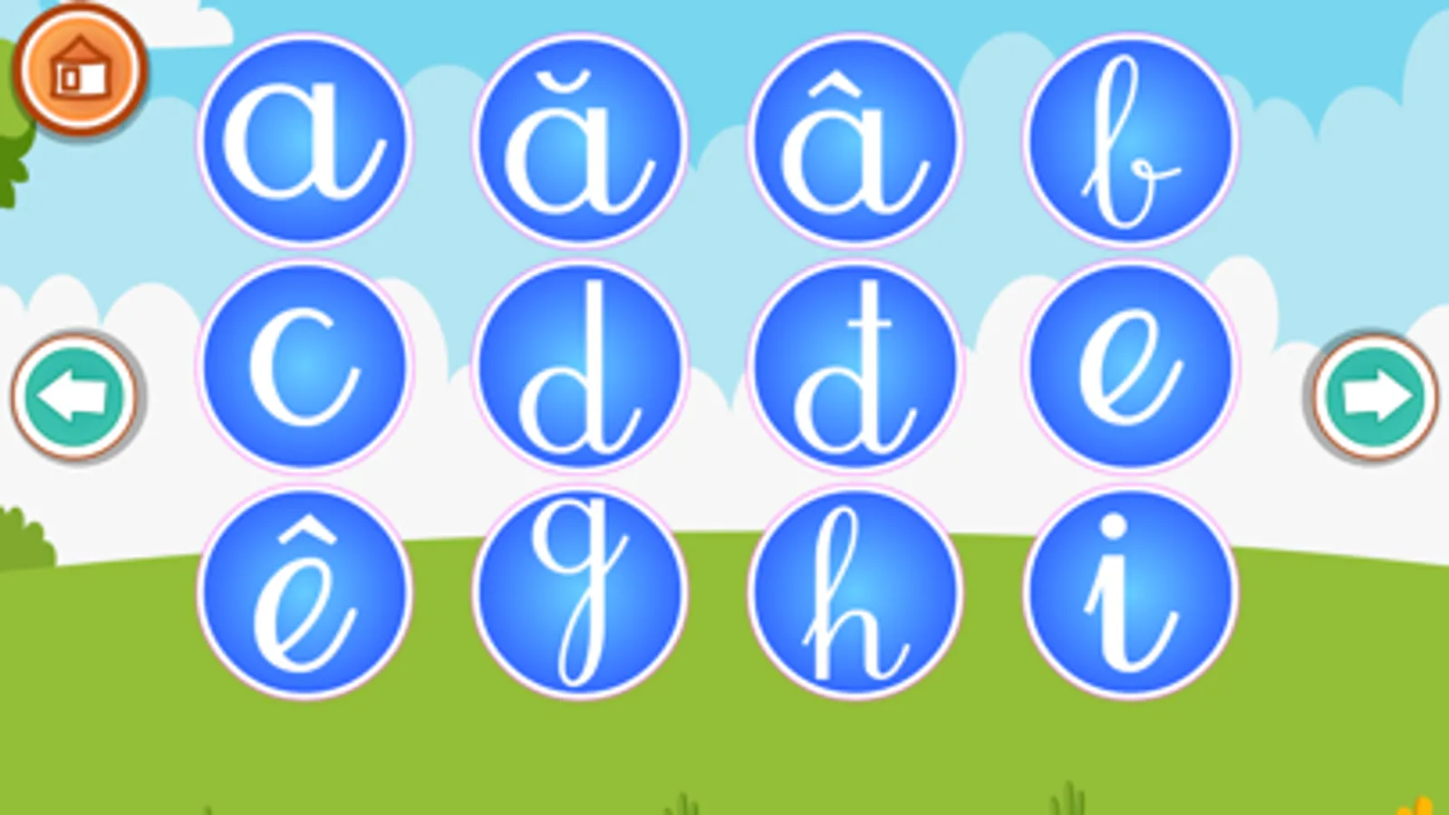 Giúp các bé làm quen với các chữ trong bảng chữ cái tiếng Việt, gồm 29 chữ cái theo bảng chữ cái phổ thông dạy trong các trường học cấp tiểu học.