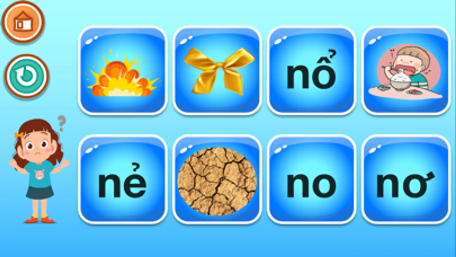 - Chọn chữ để hoàn thành từ theo ảnh đã cho. Ví dụ có ảnh chú lính cứu hoả và đưa ra từ cần hoàn thiện là "c...u hoả" và yêu cầu chọn trong 4 chữ cái "a", "ư", "e", "i" thì người dùng phải chọn chữ "ư" là đáp án đúng.