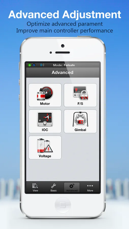 - Advanced Settings: Motor, F/S, IOC, Gimbal, Voltage.