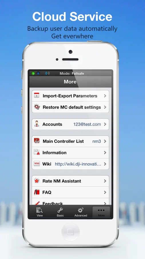 The "NM" Assistant Software is aimed at assisting the parameters configuration of NAZA-M. In addition to the accurate real-time flight data display, there is also another new feature - "Remote Parameter Adjustment".You only need an IOS equipment that supports Bluetooth 4.0 (such as: iPhone 4s, iPhone 5, iPod touch 5, iPad mini, iPad 3/4,). During the flight, you can adjust the gain value of the aircraft any time to make it more stable. At the same time, it supports data import and export and will backup in to the Clouds Server. It gives a seamless switching and will automatically save your data.