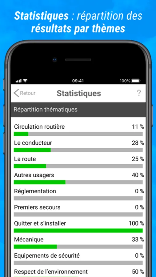 - Tests thématiques de 20 questions réparties en 10 catégories, pour réviser un sujet précis du code de la route