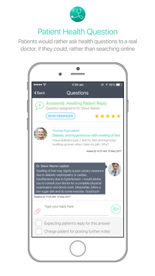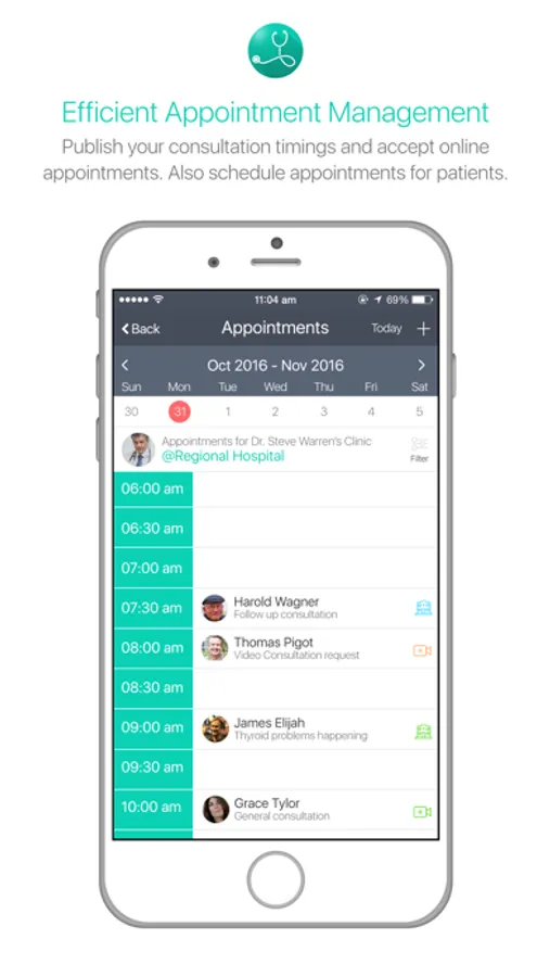 Appointments: Efficiently manage your time by displaying your consultation timings. Confirm, reschedule or cancel appointments using the app. Your patients will receive SMS and email reminders about upcoming visits to prevent no-shows.