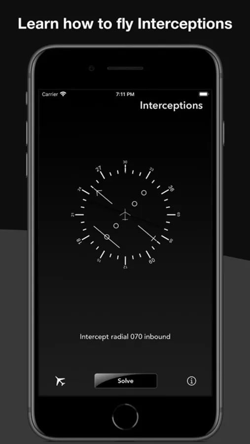 - INTERCEPTS: the calculation of interception headings to and from VORs. The exercises are randomly generated and will never go beyond a 90° intercept.