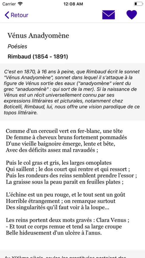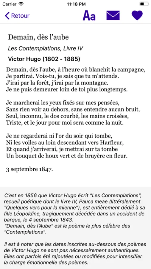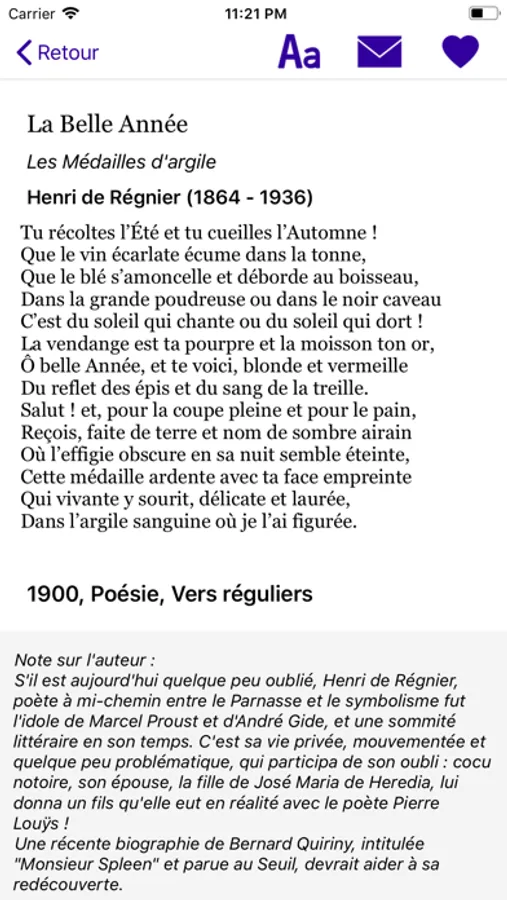 Par les créateurs d'Un Texte Un Jour, Un Poème Un Jour vous permet de redécouvrir les poèmes de la littérature française sous une forme ludique et originale, en recevant chaque jour un extrait choisi et contextualisé.