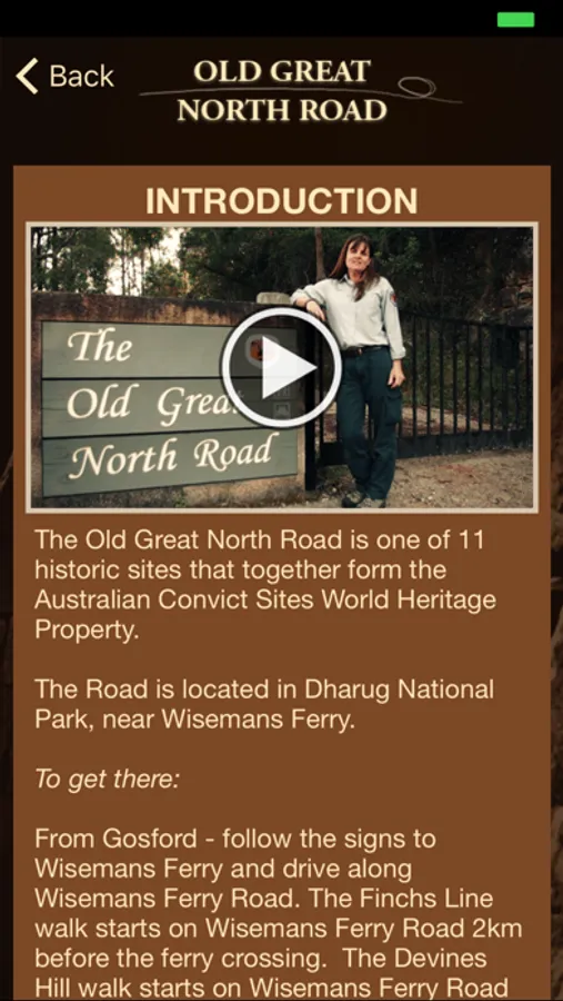 The Convict Road App brings the history of the Old Great North Road World Heritage site alive. Hear from National Parks and Wildlife Service Ranger Sarah Brookes, discover the secrets of the Old Great North Road and immerse yourself in the past as you follow in the footsteps of the convicts, soldiers and government officials who built the Road. Featuring two walks, short films about the convict experience and expert commentary, this App is a must for anyone interested in Australia’s convict past.