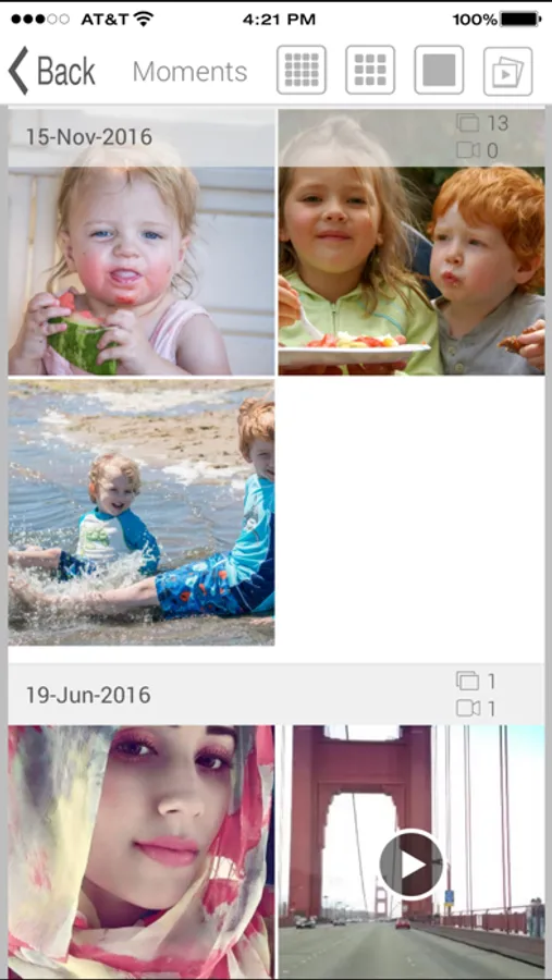 2) Moments mode: Watch photos/videos organized and grouped by date.
