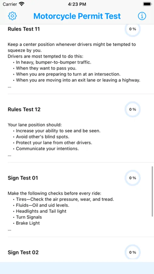 Riding Test contains all of the categories one needs to study to pass the written test, which include,