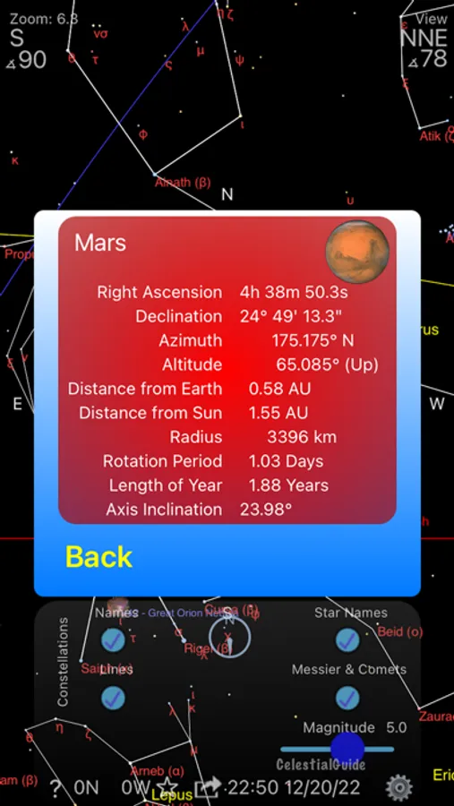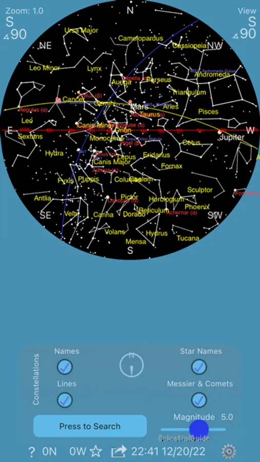 Celestial Guide is an interactive database of information about stars and planets. Its basic interface is a map of the sky as seen from any point on Earth at any point in time.
