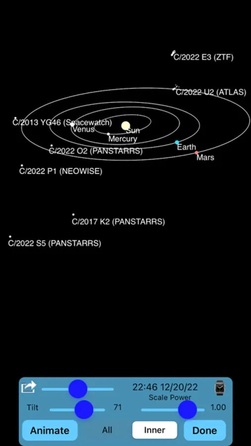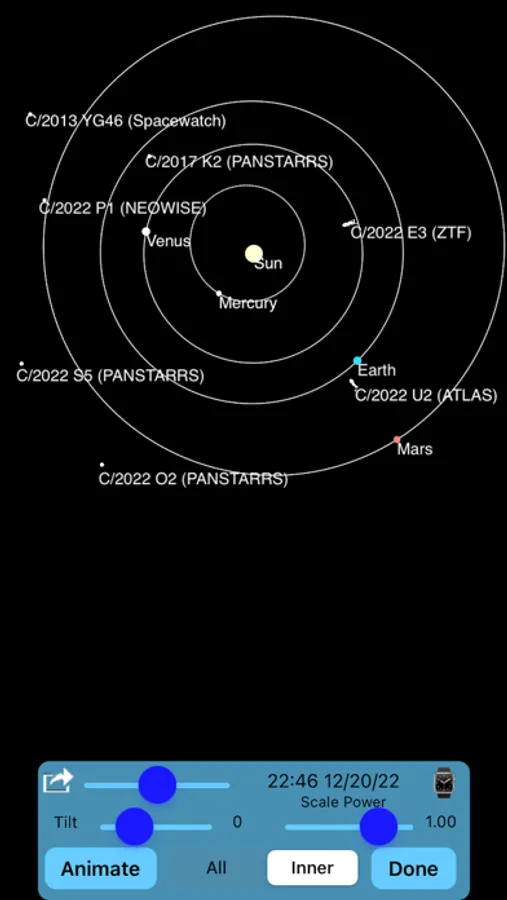 CelestialGuide also includes a Virtual Orrery, displaying the relative position of the planets and comets at any point in time.