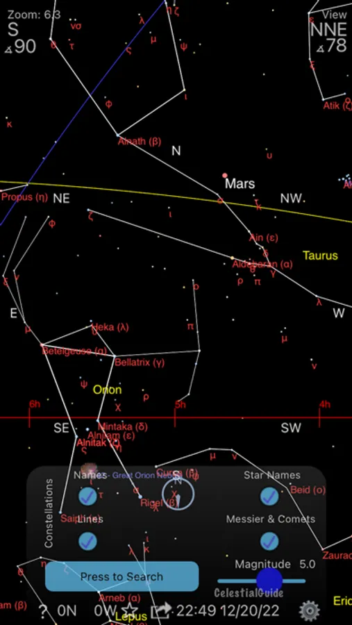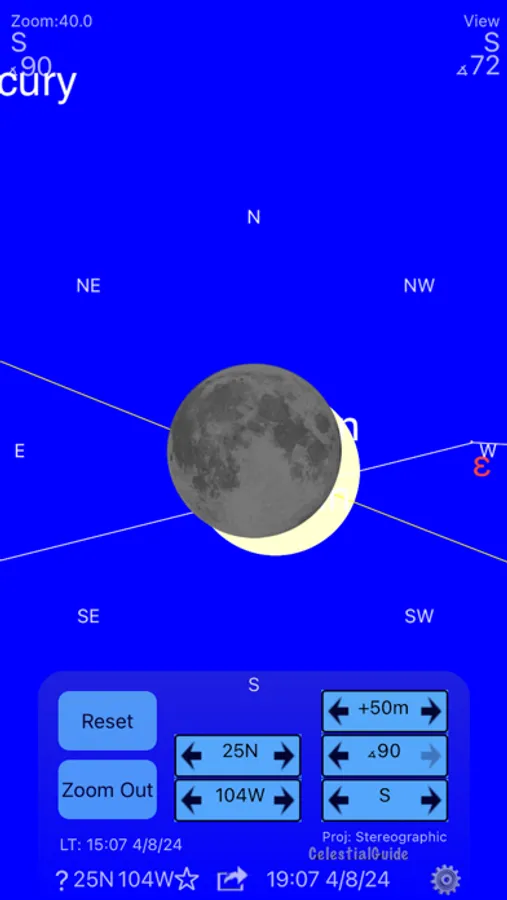 The user can manually choose the time and location, or the iPhone's or iPad's GPS and clock can be used to select the current time and location. If the device is pointed at the sky, the map on the screen will be presented corresponding to the actual view in that direction.