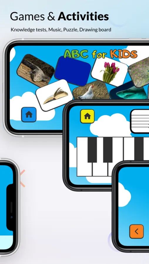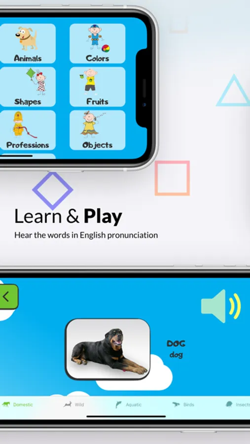 - Animals: Domestic Animals, Wild Animals, Aquatic Animals, Birds, Insects - discover the world through beatiful images of animals and their specific sounds;