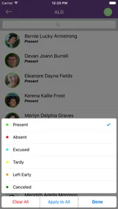 • Call the roll with your Apple device . Simply mark the appropriate attendance status for each student: present, absent, tardy. Also add your own custom status.