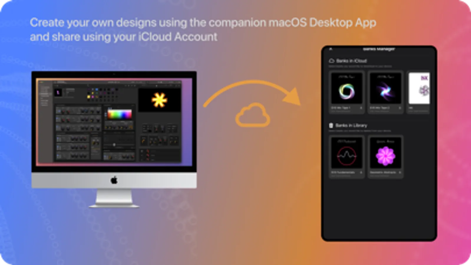 Design your own presets using Euler Visual Synthesizer for macOS, organize them into banks, for synchronization with your iOS device through iCloud.