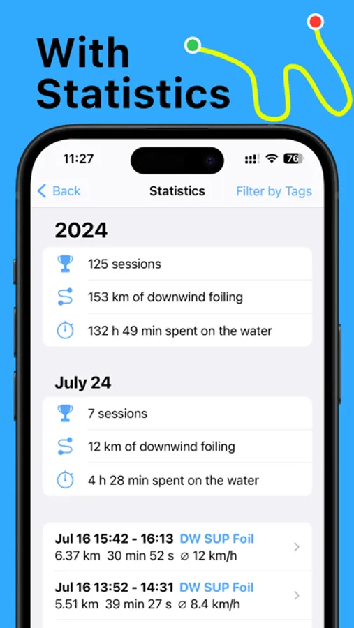 - In-depth analytics: View yearly and monthly stats like number of sessions, days on water, and distances covered at a glance.