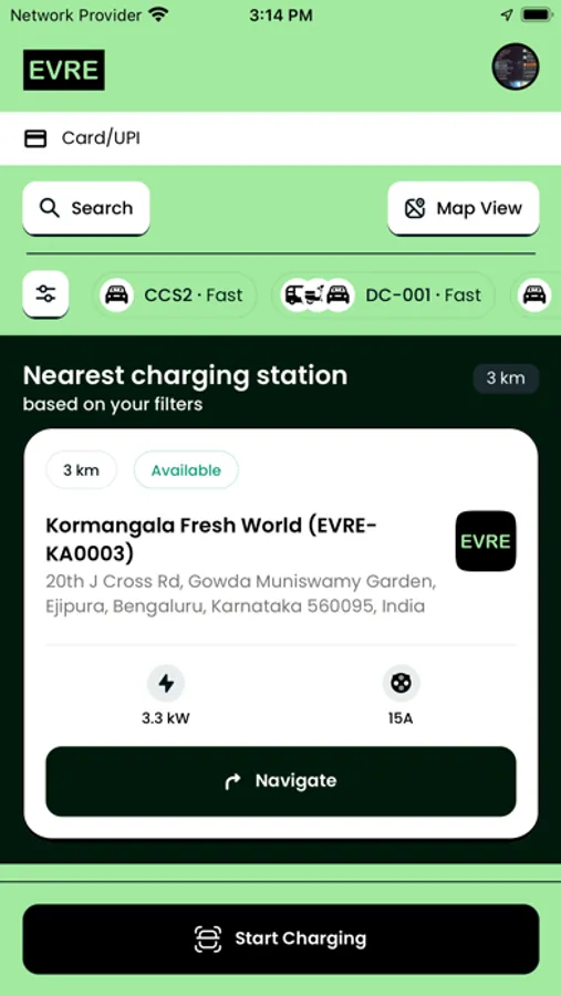 EVRE Charge allows user to charge their EV from the app. Users can save charging stations they want to reuse and browse through their charging history.