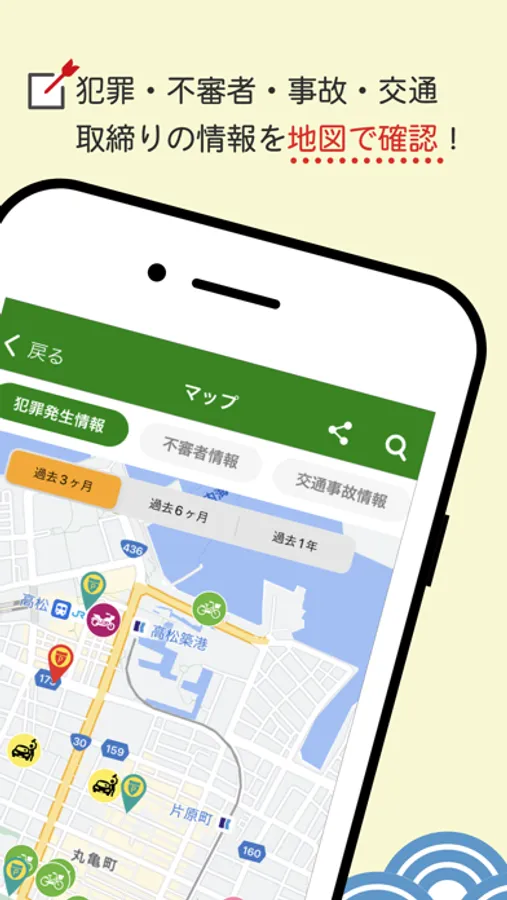 犯罪・不審者・交通事故・交通取締り情報をマップで確認することができます。