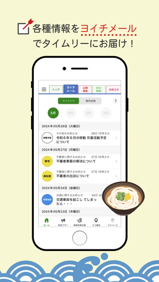 香川県警察が配信している「安全・安心ヨイチメール」をアプリ利用者にもお届けします。