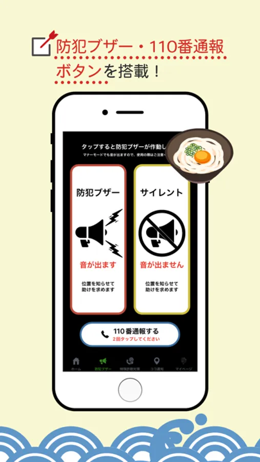 画面をタップするだけで音と光で周囲に異常を知らせるとともに、事前登録している家族等に防犯ブザーを使用した位置情報付きでお知らせします。