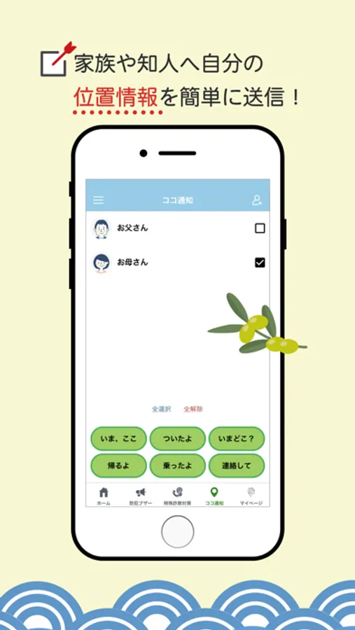 事前登録した家族等のメンバー間で、簡単なメッセージを添えて位置情報の送信ができます。