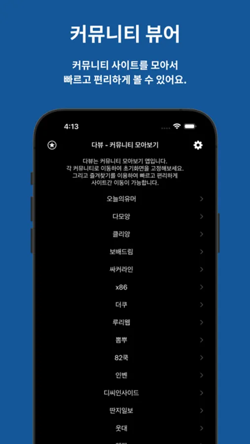 여러 커뮤니티의 베스트, 추천 게시물을 위주로 볼 수 있으며, 커뮤니티 보기에 최적화된 기능들을 제공합니다.
