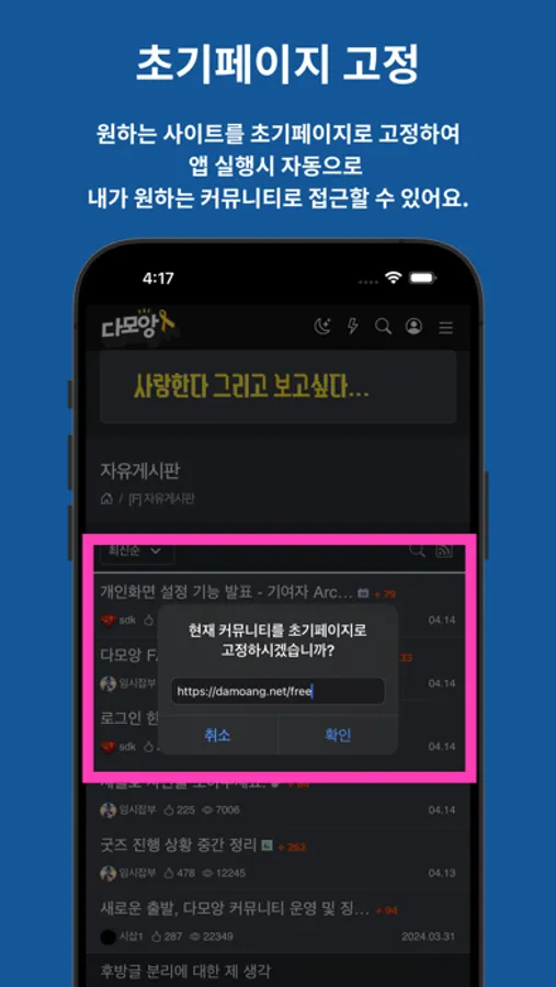 각 커뮤니티를 초기화면으로 고정하면, 앱 실행시 바로 해당 커뮤니티로 이동하는 "초기 페이지 고정" 핀 기능을 이용해보세요.