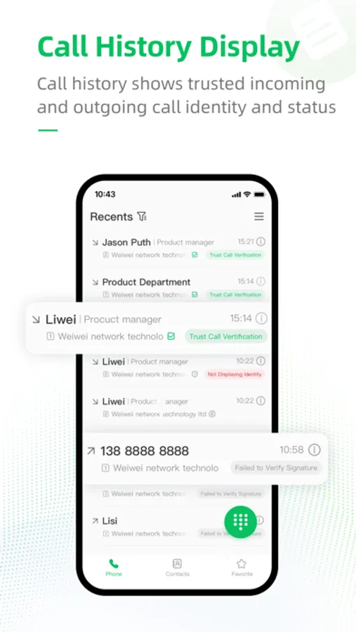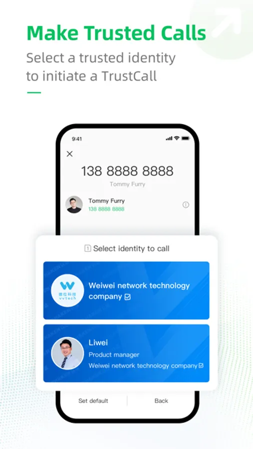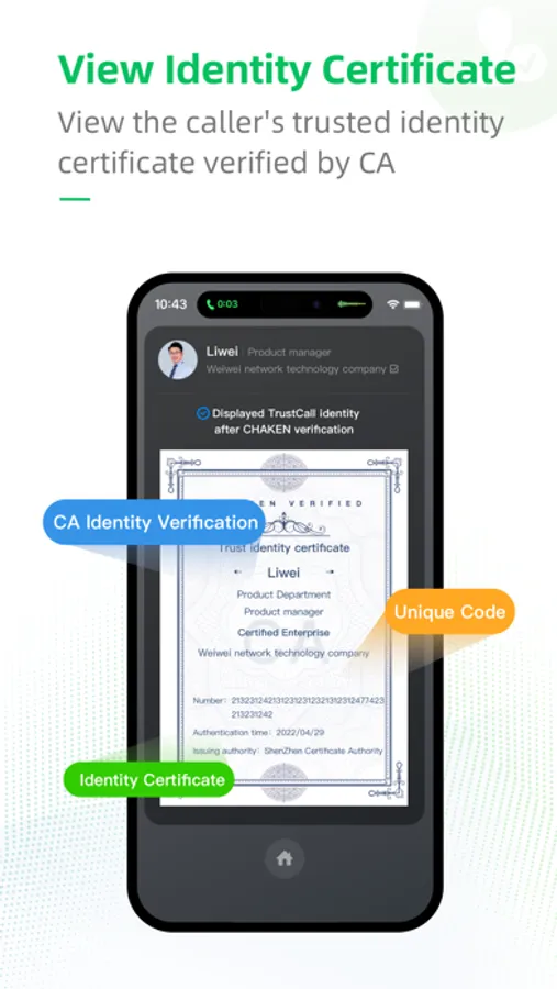 Trust Call is a cutting-edge mobile communication app that leverages advanced computing and state-of-the-art encryption technology. It ensures legally binding and tamper-proof caller identities throughout the entire process of authentication, transmission, and display, solving the problem of untrusted caller identification.