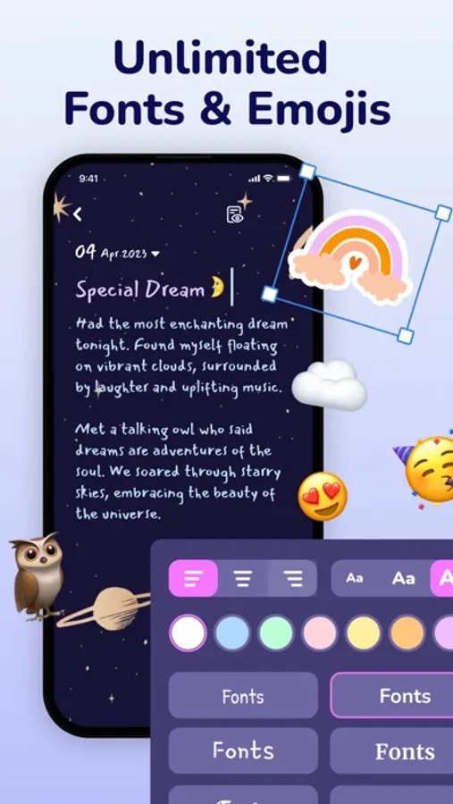 Customize your diary experience! Enjoy unlimited text input options with a variety of fonts, colors, and styles (like bold or italic). Also, with exciting stickers and fun emojis, you can add a little extra fun to your every diary page.